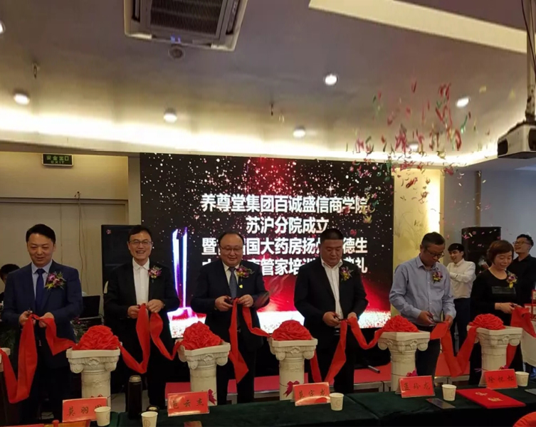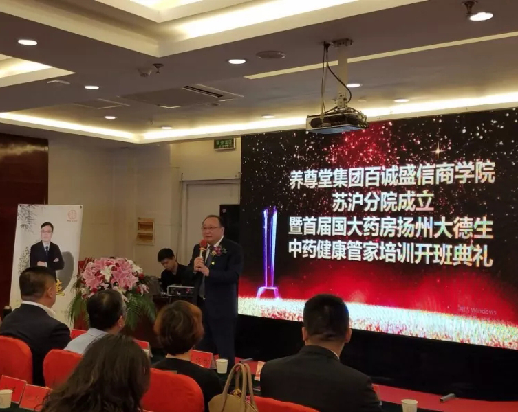 4月27日,养尊堂百诚盛信商学院苏沪分院成立暨首届国药控股国大药房扬州大德生中药健康管家培训开班典礼在扬州隆重举行!养尊堂总裁莫定龙,培训副总裁范云杰、苏沪分公司总经理莫羽周、国药控股国大药房扬州大德生连锁有限公司总经理孟玲龙等相关领导及药店培训学员应邀出席了本次盛典!